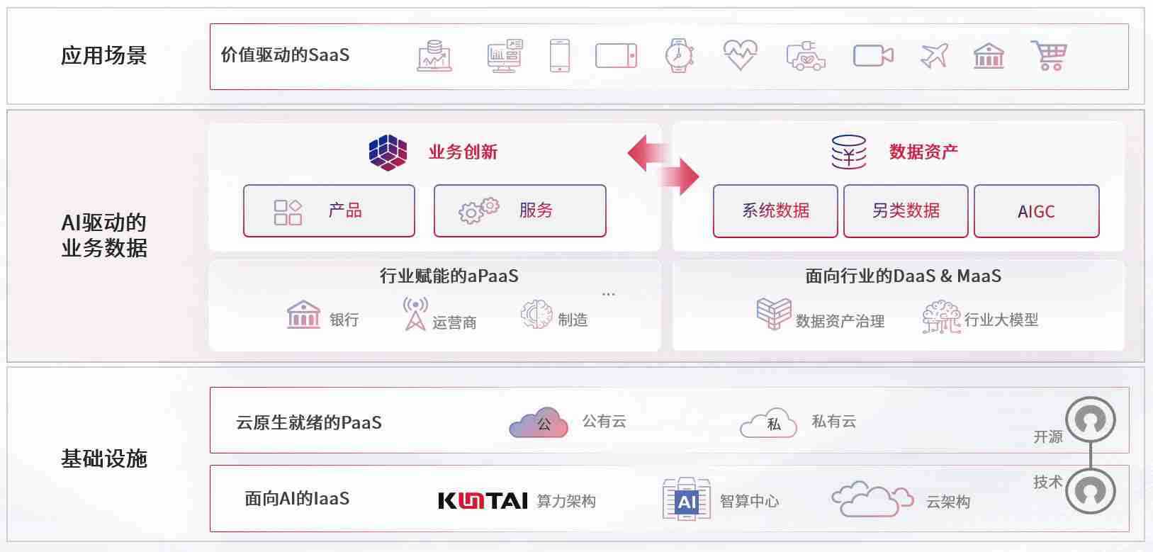 数字时代,,围绕企业数字化转型的关键要素,,,ALLBET数码开创性的提出数云融合战略和技术体系框架,,,,着力在云原生、、数字原生、、AI原生和信创产业上架构产品和服务能力,,,为处在不同数字化转型阶段的快消零售、、、汽车、、、、金融、、、医疗、、政企、、、、教育、、、运营商等行业客户提供泛在的敏捷IT能力和融合的数据驱动能力,,,构建跨界融合创新的数字业务场景和新业务模式,,助力企业级客户建立面向未来的核心能力和竞争优势,,全面推动社会的数字化、、智能化转型升级。。
